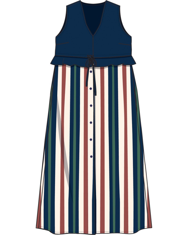 Féminine de par son empiècement poitrine légèrement volanté, ajustable par un lien coulissant, moderne de par son jeu de rayures graphiques et stylées, elle se portera idéalement avec des chaussures compensées pour allonger la silhouette.