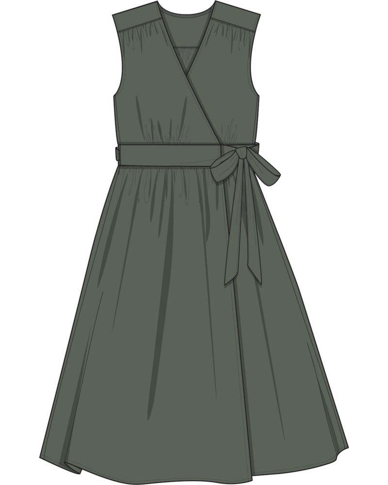 Sa large ceinture se drape et se noue à la taille pour affiner la silhouette.